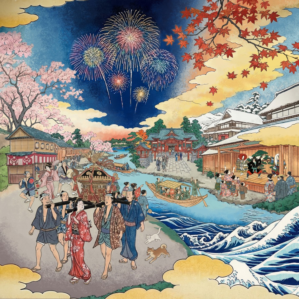 生成AIも活用し、「春」の桜や神輿担ぎ、「夏」の花火や舟遊び、「秋」の紅葉や寺巡り、「冬」の雪景色や芝居小屋など、四季の美しさや江戸の町の賑やかさを浮世絵風のイラストで1つの世界観として表現しました。