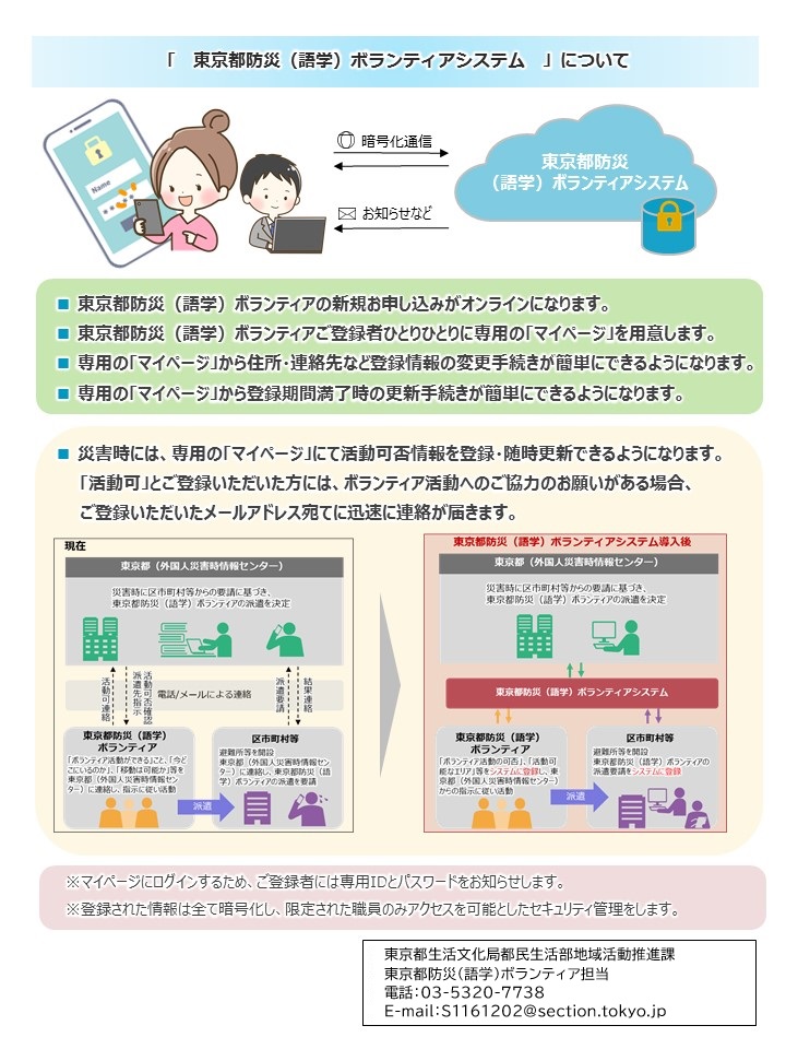 東京都生活文化局では、東京都防災(語学)ボランティア(以下「語ボラ」という。)の登録情報の管理と、災害時に避難所等への語ボラの派遣を円滑に行うためのシステムを、令和4年度から導入しました。