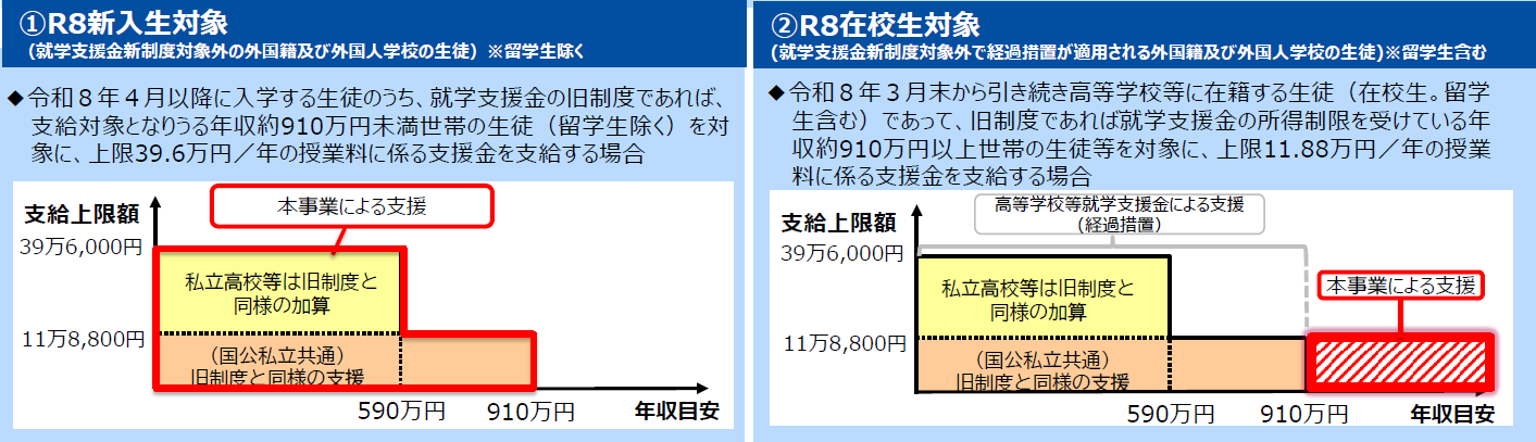 旧制度であれば対象となる改正前の就学支援金法第2条に規定する高等学校等(新制度で廃止となった各種学校のうち告示指定を受けた外国人学校を含む)に通う生徒のうち、就学支援金新制度の対象外となる外国籍又は外国人学校の生徒