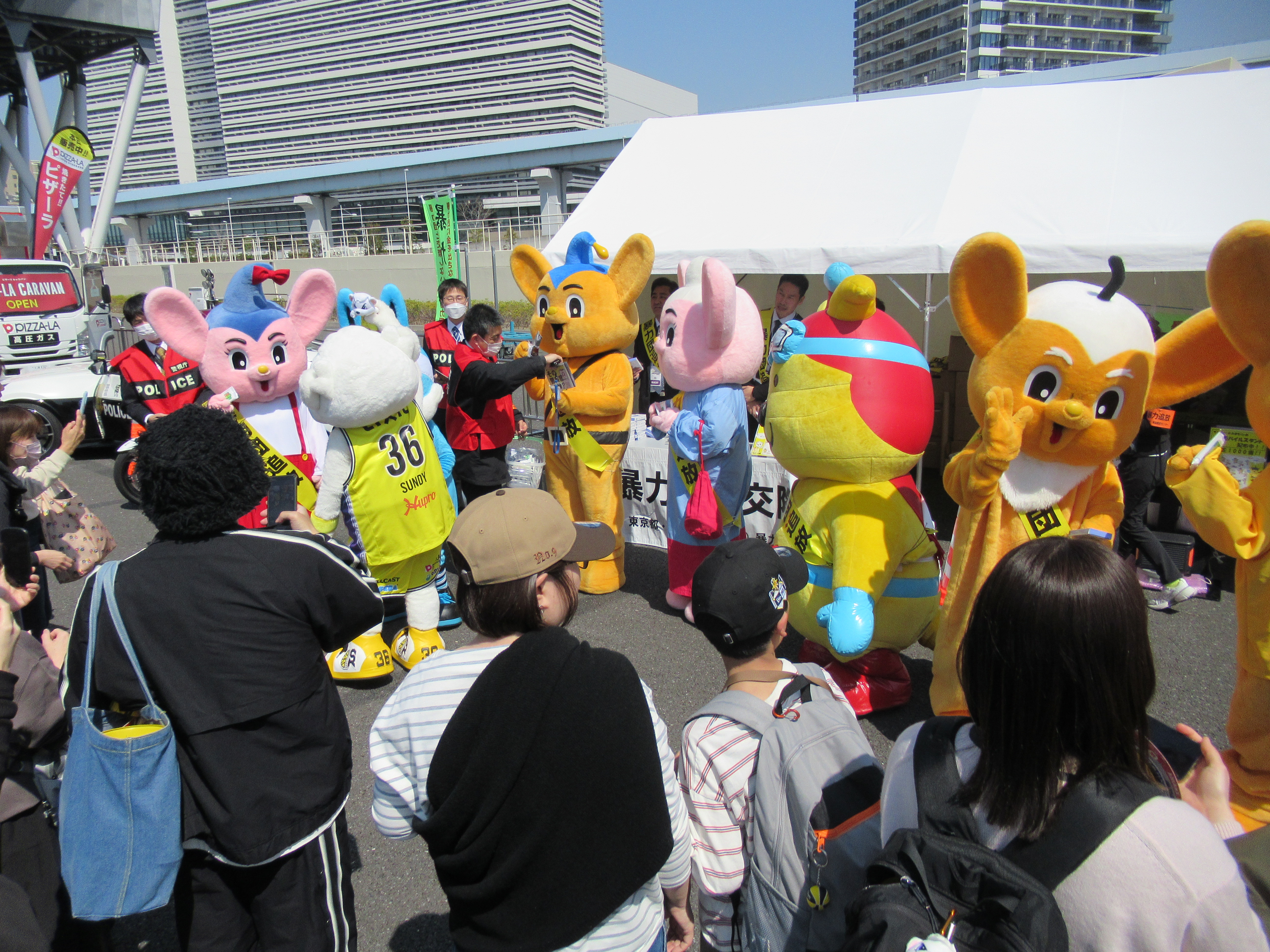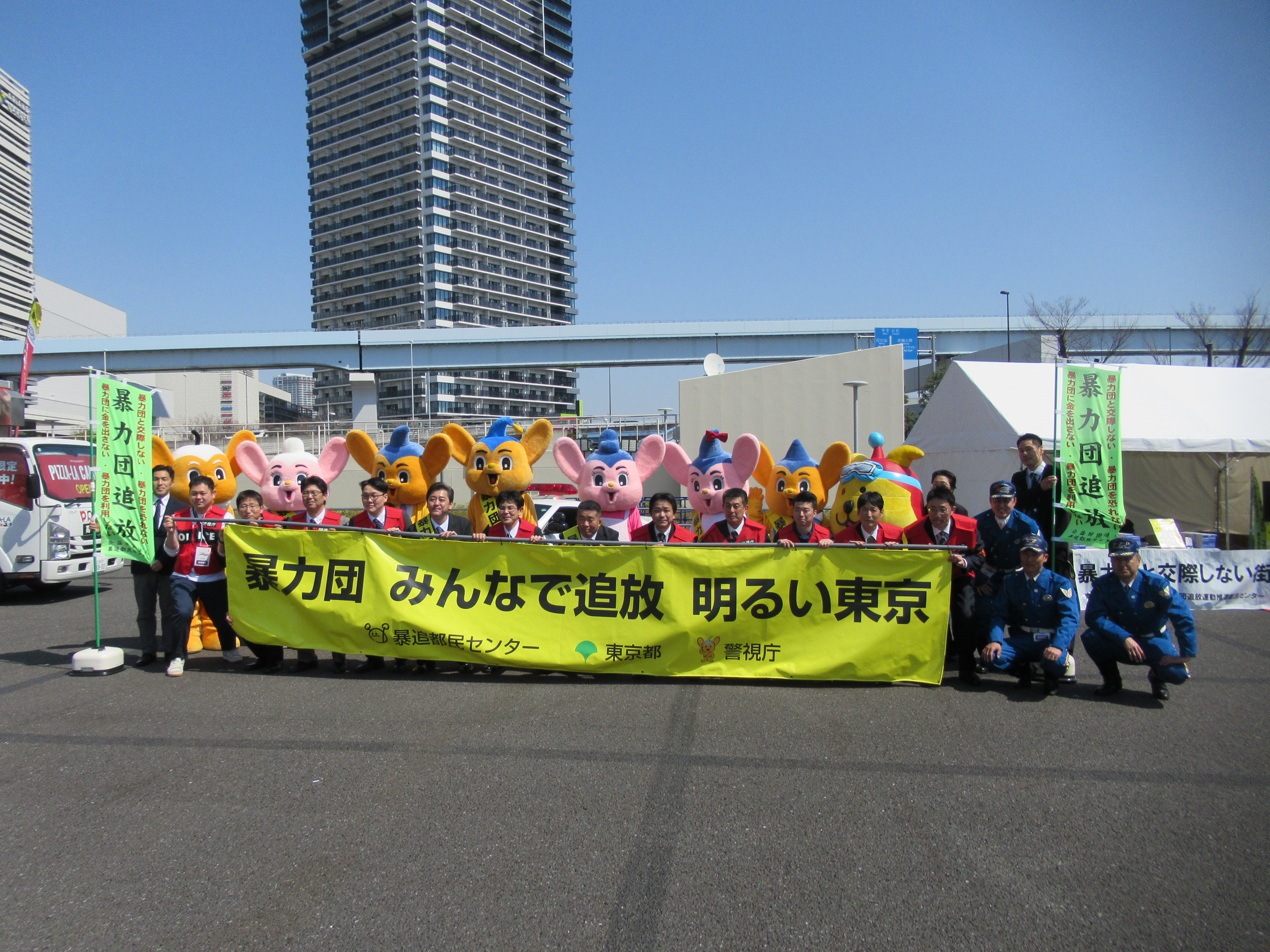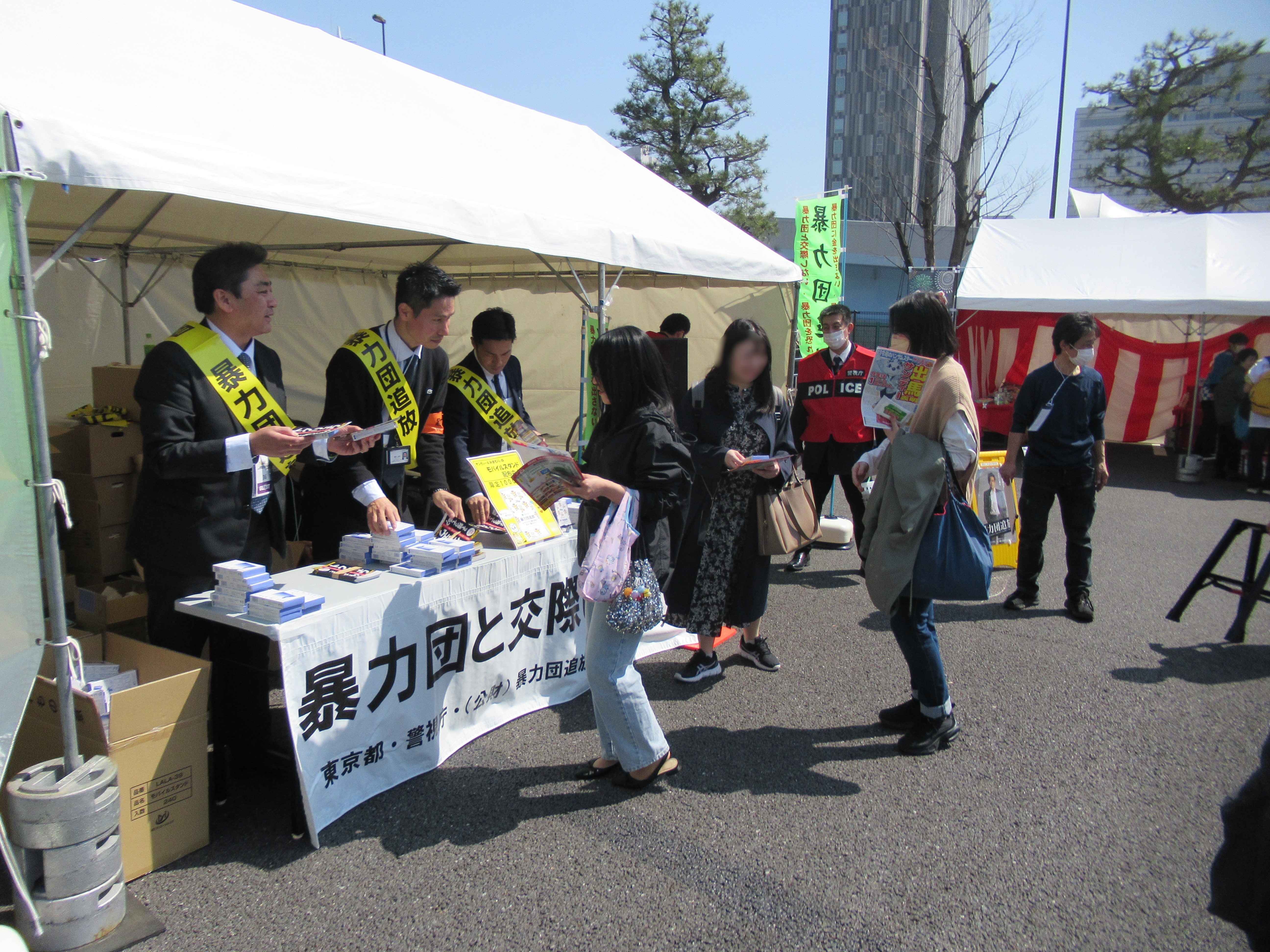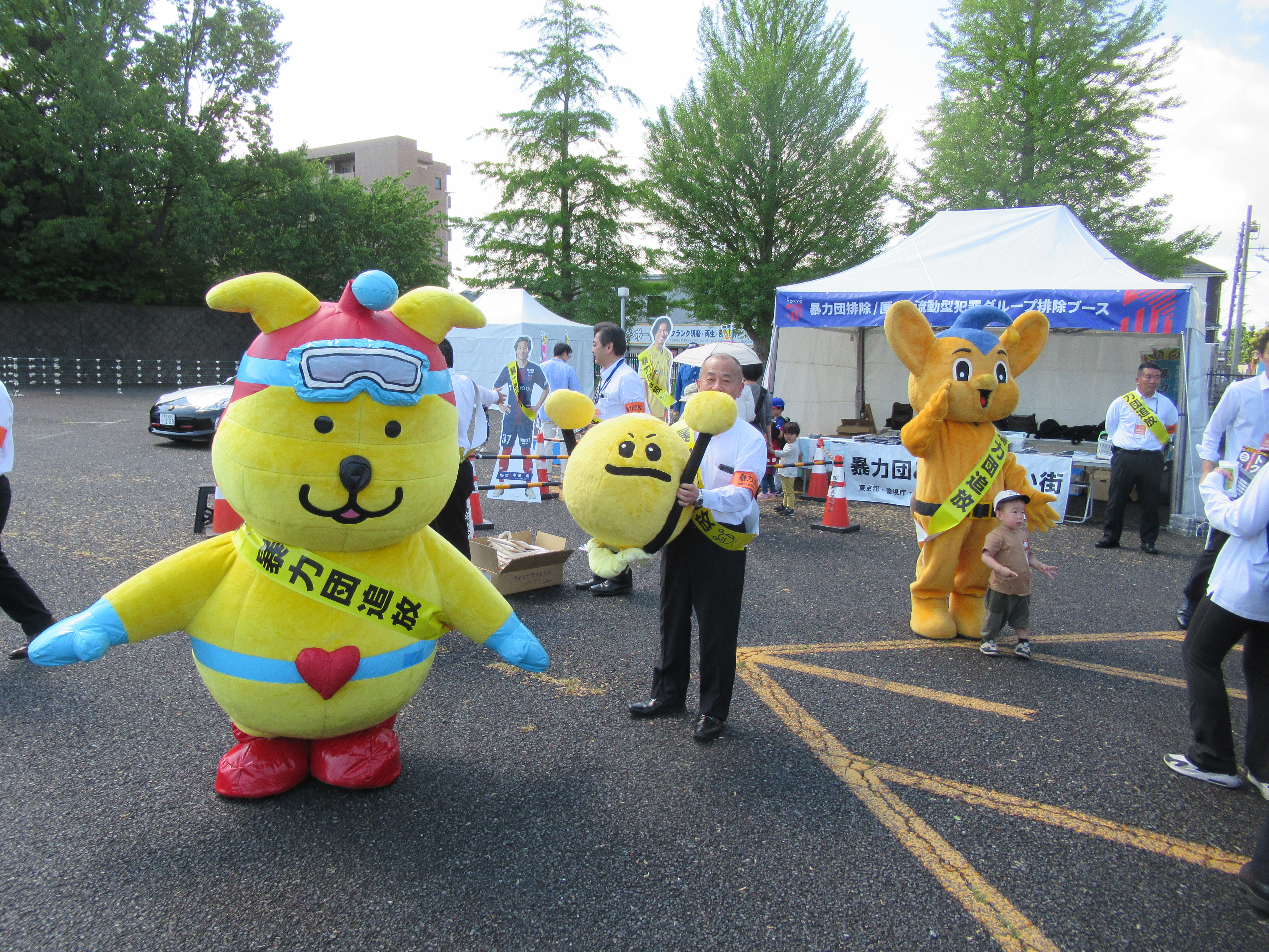イベントでは、特設ブースにおいて、警視庁のパトカー、白バイの展示や「みまもりぃぬ」と「ピーポくん」、「東京ドロンパ」(FC東京マスコットキャラクター)が暴力団排除の啓発品の配布を行い、「暴力団と交際しない」ことに加え、匿名・流動型犯罪グループによる犯罪に注意するように呼びかけを行いました。