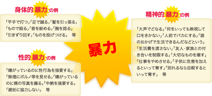 暴力の形態の例は、内閣府「配偶者からの暴力 相談の手引き」「人と人とのよりよい関係をつくるために交際相手とのすてきな関係をつくっていくには 指導者用手引」等によるものです。