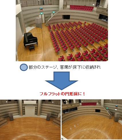 ウィメンズプラザのホールは、ステージと客席を床下に収納し、1階をフルフラットの円形床にすることができます。1階をパフォーマンス空間として、2階を観客席とすれば、地域のスポーツクラブや学校のダンス仲間などの発表の場としてまさにぴったりです。