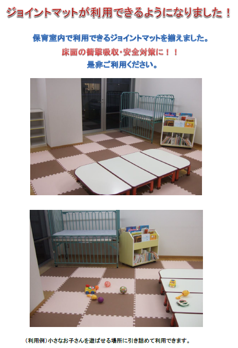 保育室ご利用者様からのご要望にお応えし、ジョイントマットを揃えました。