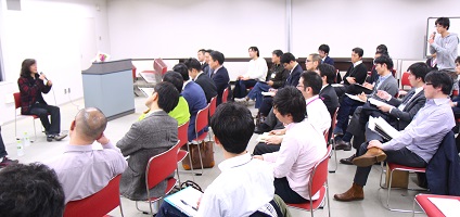 パパの育児応援塾の第2回は、ダイアモンド✡ユカイさんが登場!ユカイファンのパパを含む計36名の受講生が拍手でお迎えしました。