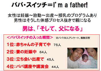 ユカイさんのトークの後は「パパ・スイッチ」に関するワークです。男性は女性と違い、妊娠から出産まで親になる体感がありません。赤ちゃんの子育て中や妻の妊娠中など様々なタイミングでパパ・スイッチが入り、父親になる自覚が芽生えるものです。グループ内でお互いに、“どんな時にパパ・スイッチが入ったか”、そして、“父親になって感じたこと”について語り合いました。